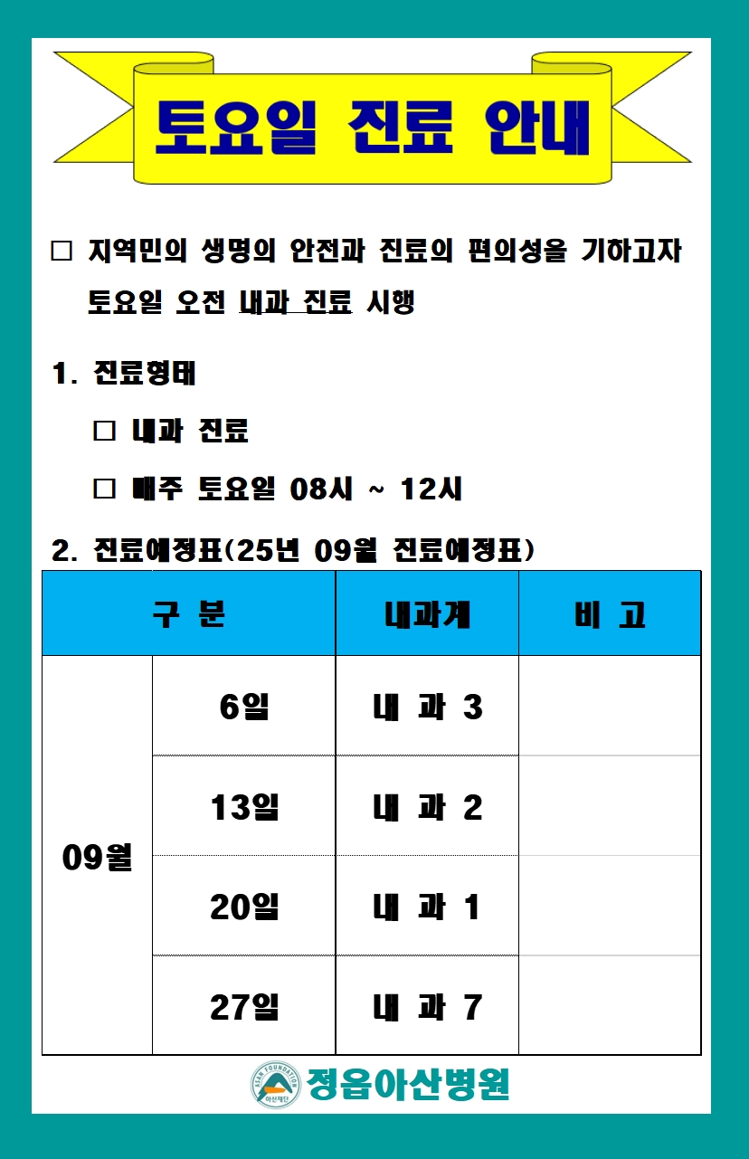 12월 토요일 내과외래 진료 안내(08:00 ~ 12:00)