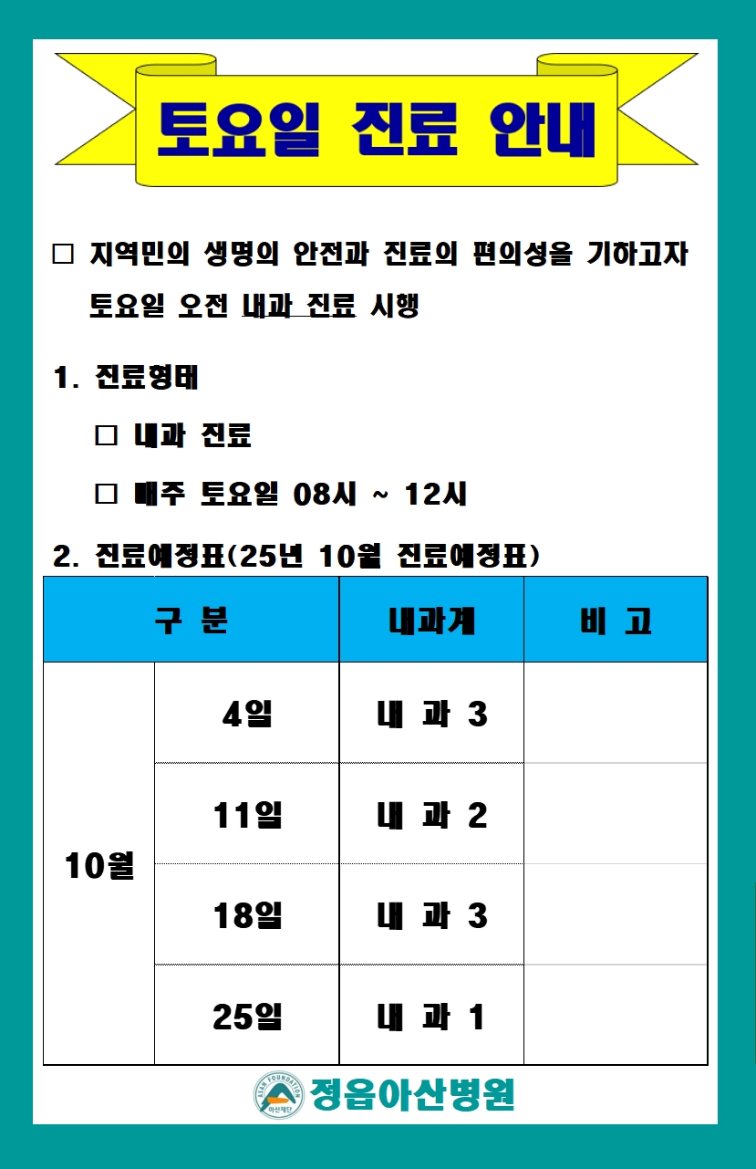 12월 토요일 내과외래 진료 안내(08:00 ~ 12:00)