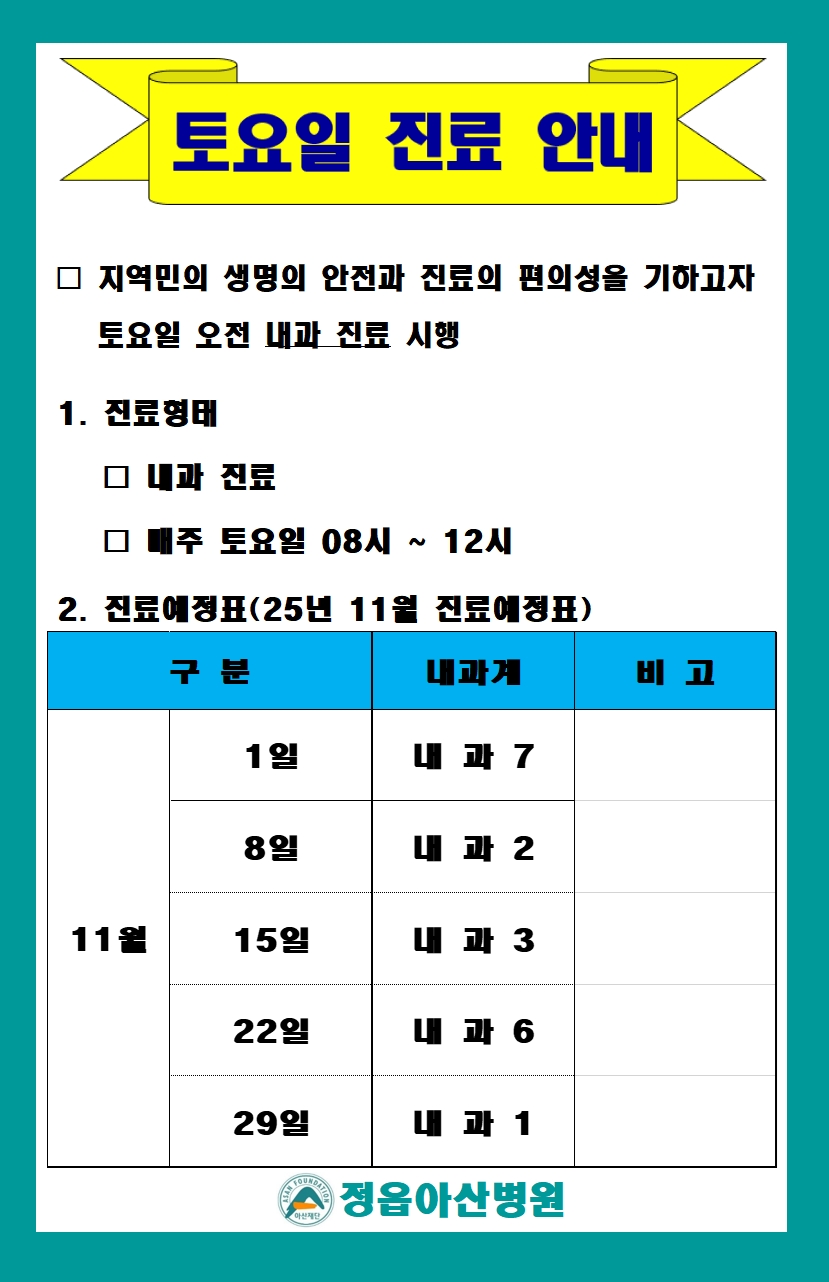 12월 토요일 내과외래 진료 안내(08:00 ~ 12:00)