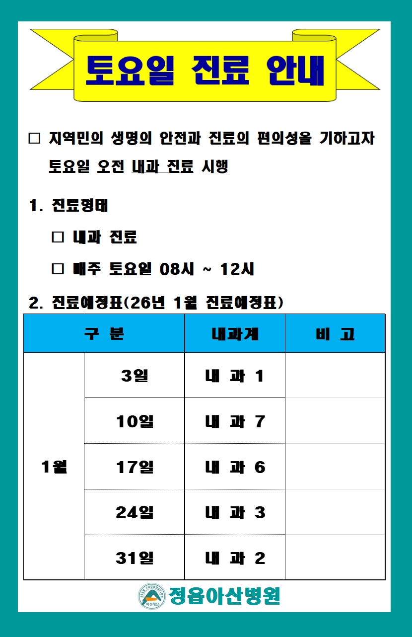 2026년 1월 토요일 내과진료 안내