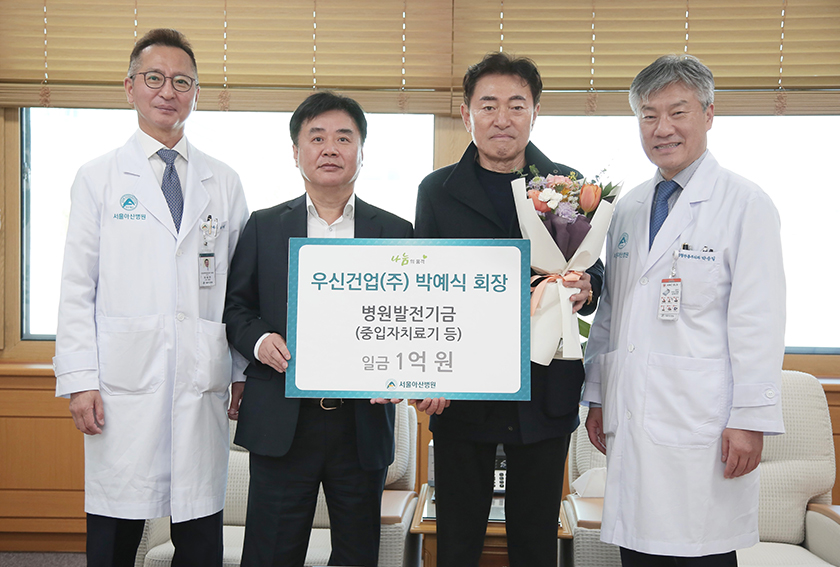 건설용 석재 체굴업체인 우신건업(주)의 박예식 회장이 중입자치료기 도입을 위하여 병원발전기금 1억 원을 후원했다. 2024년 3월 13일 진행된 감사패 증정식에는 박예식 회장, 박승일 병원장, 임종진 관리부원장, 최재원 대외협력실장 등이 참석했다.